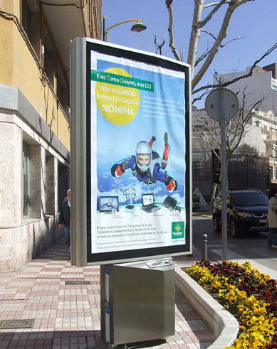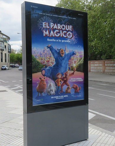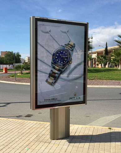 Gracias a su construcción fina y diseño elegante, el mupi SLIM 22 es ideal para ser instalado en lugares donde haya poco espacio disponible: centros comerciales, ciudades y estaciones de tren o autobús. Cuenta con iluminación LED, por lo que la publicidad estará visible las 24 horas del día.